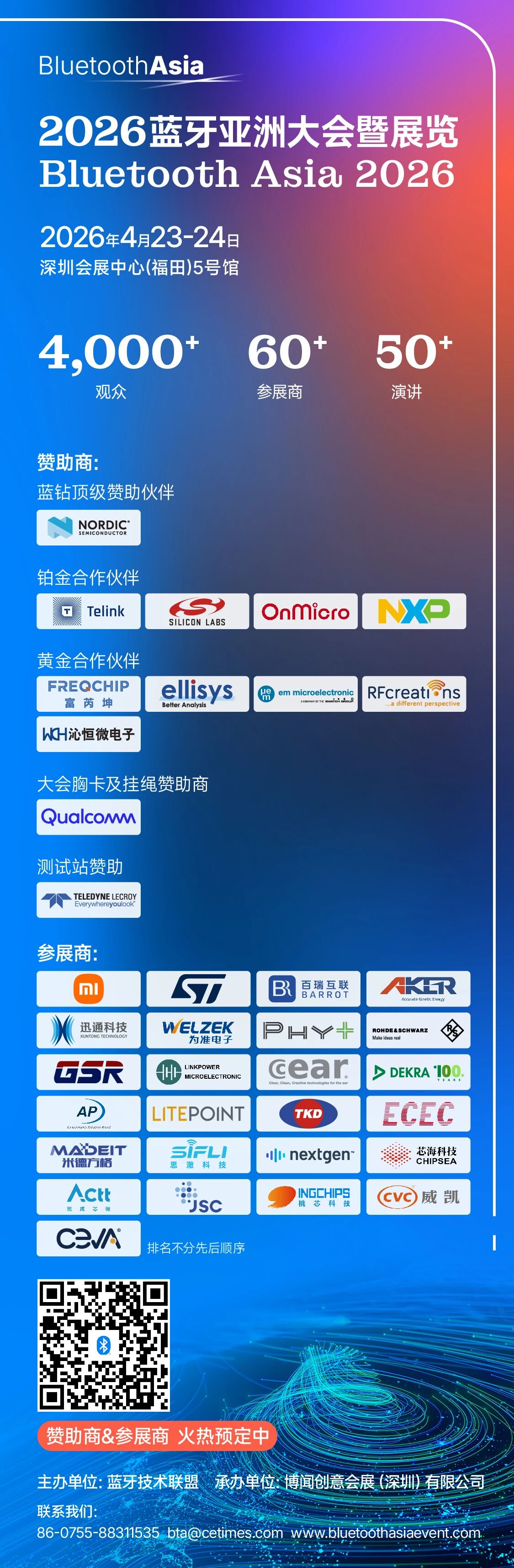 作为中国最具影响力的蓝牙技术与产业盛会,2026年蓝牙亚洲大会暨展览(Bluetooth Asia 2026)将于2026年4月23日至24日在深圳会展中心(福田)5号馆盛大举行。大会将汇聚全球行业领袖、创新先锋与开发人员,共同探索蓝牙技术如何驱动下一代无线连接生态的发展。